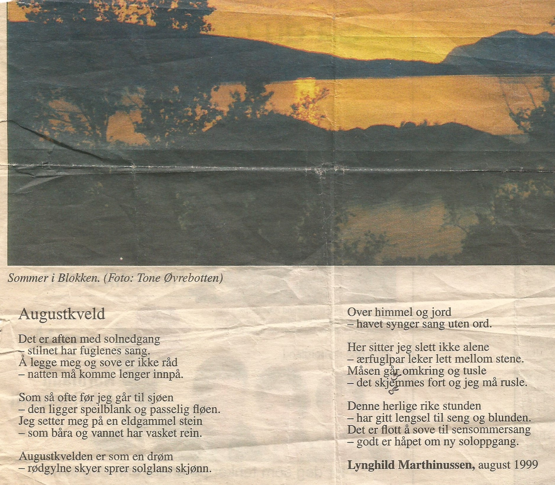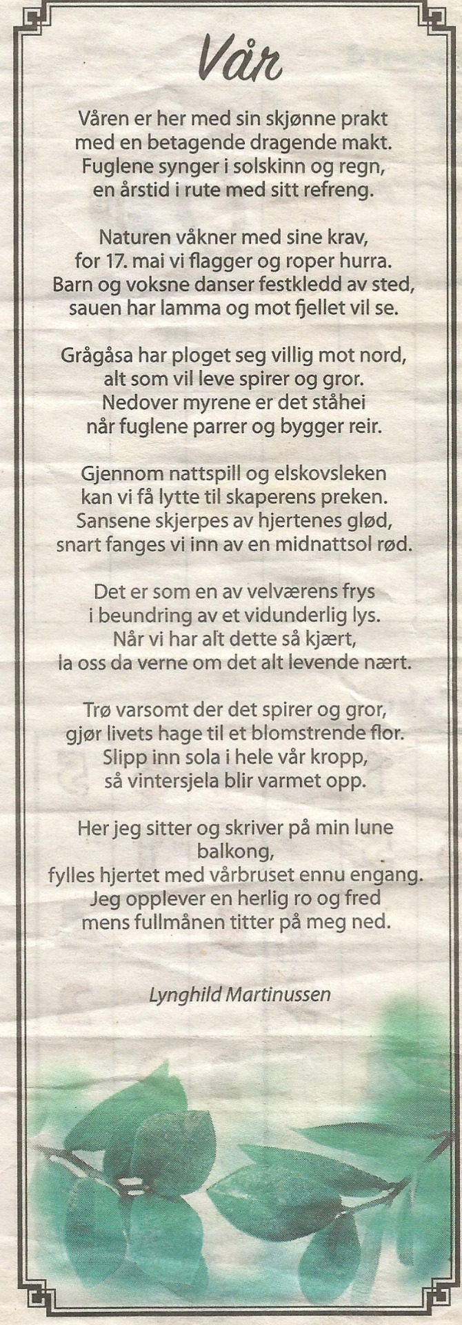 Noen av diktene til Lynghild er tvetydige - hun tar gjerne utgangspunkt i naturen, men det handler likevel minst like mye om forholdet mellom mennesker! Dette første diktet er et godt eksempel på dette - og i tillegg er formen ganske moderne. Vær-så-god - her er diktet