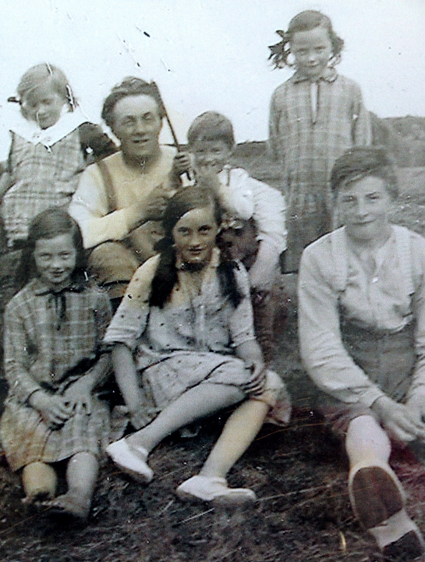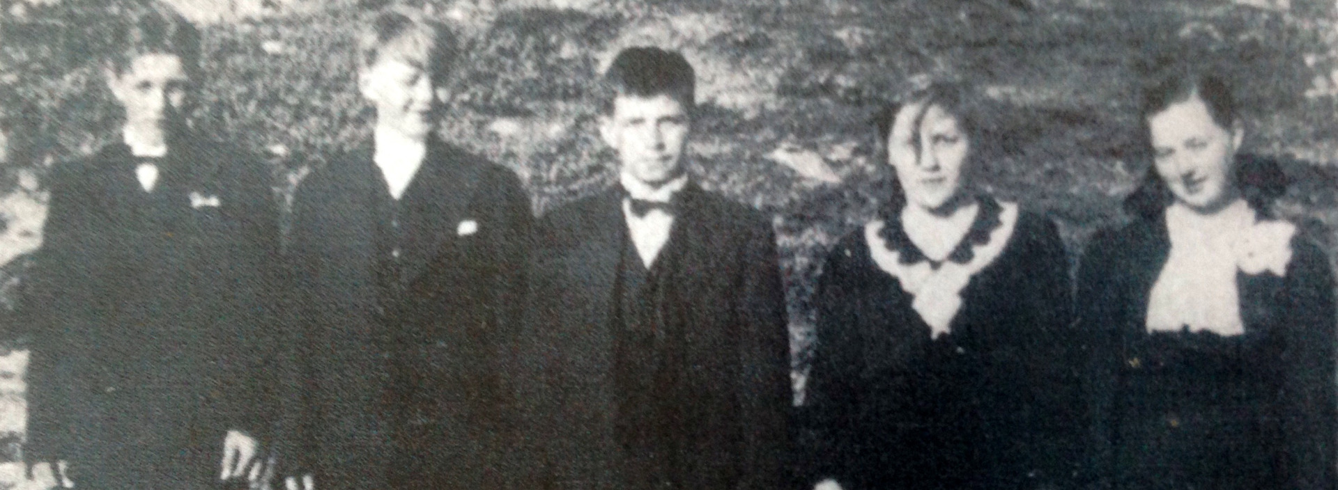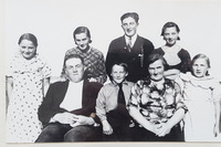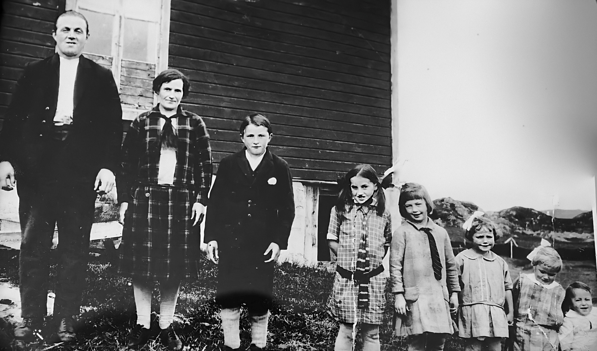 Familiebilde fra rundt 1936. Bak ser vi fra venstre Ester, Ivarny (Mossi), John, Lynghild og Julie (Mole). Foran Julius, Ivar og Julie.