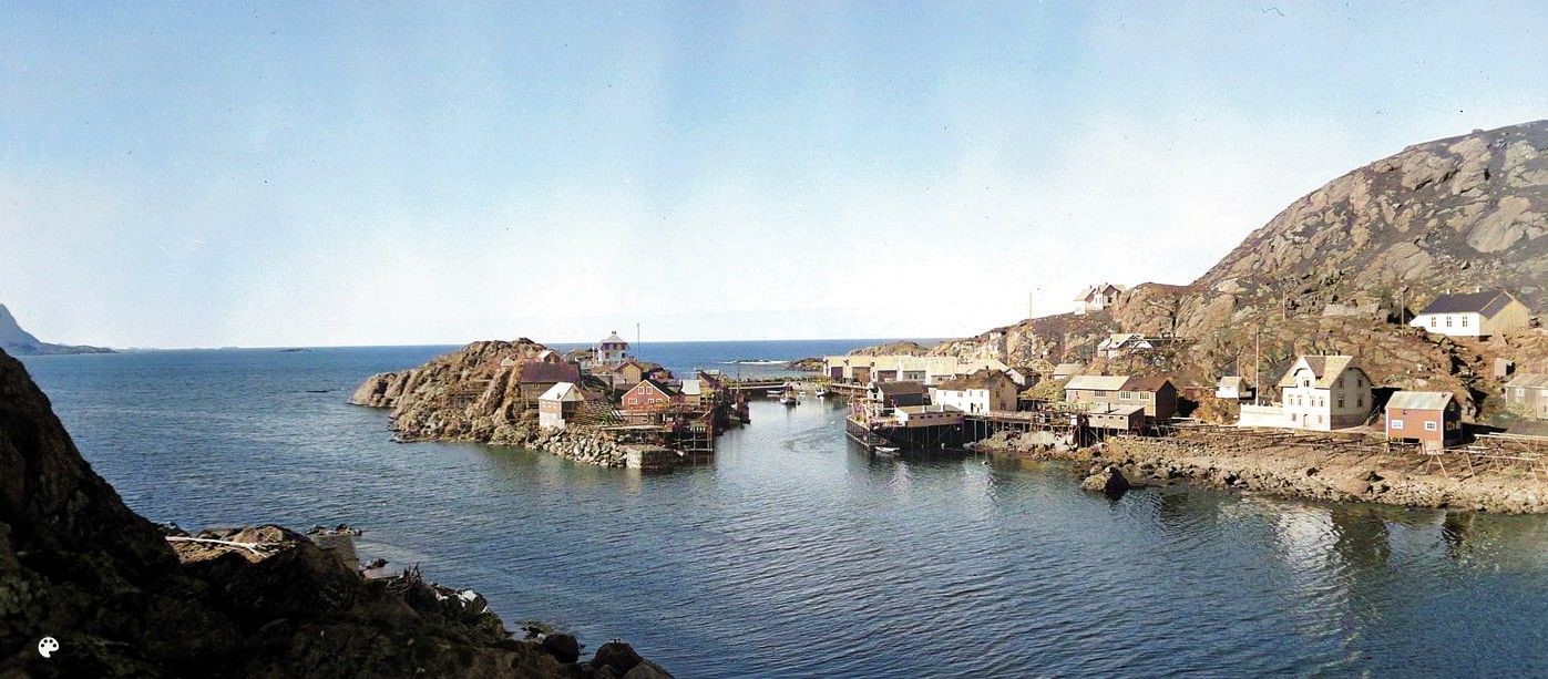 Nyksund 1938. Bildet er fargelagt av JH. Gamlehuset ser vi litt beskåret helt i høyre bildekant.
