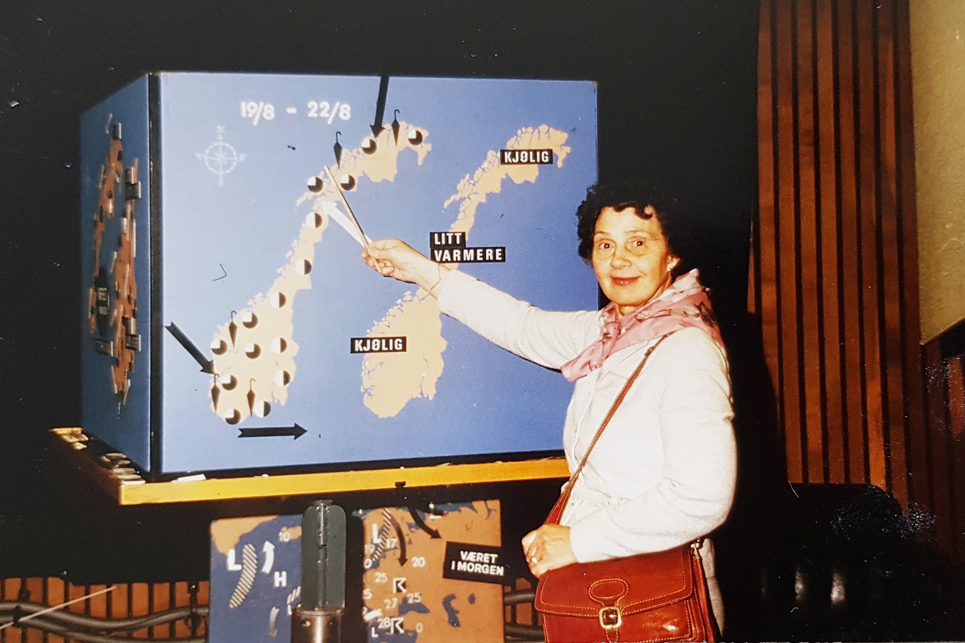 På et av besøkene sørpå var Lynghild og Ottar en tur innom NRK i Oslo, eldstesønn Jan arbeidet der en periode. Her er Lynghild i værmeldingsstudio og viser været i Vesterålen for neste dag !!
