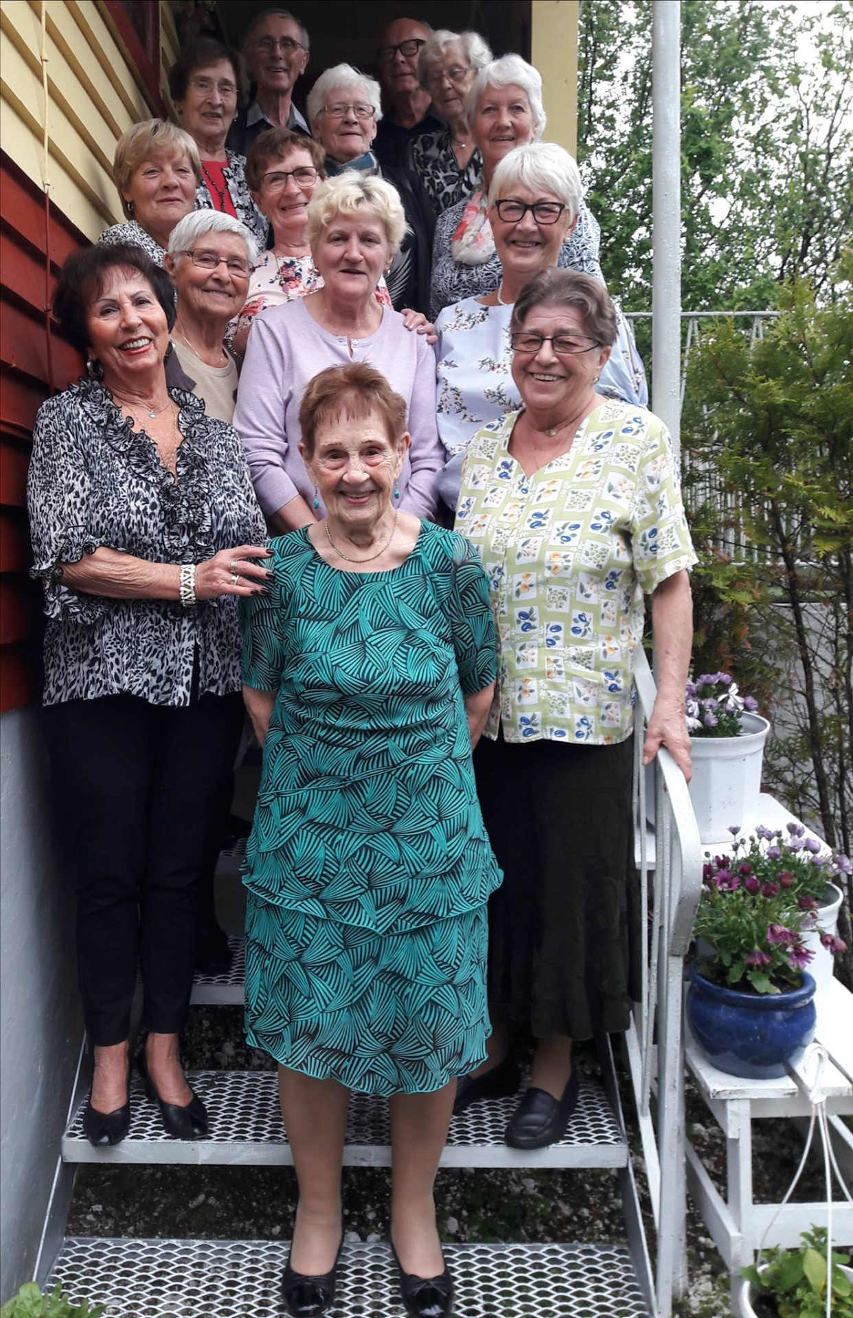 Susanne (oldebarn), Janne (barnebarn), Dag Roar (sønn), Ingeborg (svigerdatter). Mellom Ingeborg og Lynghild står fremst Tuva og Elise og bak dem Anette og Ole-Ottar (alle er barnebarn). Til høyre for Lynghild står Jan (sønn), Målfrid (svigerdatter) og Ida-Kristin (barnebarn). Bak dem ser vi Elise (g.m. Dag Ove) og barnebarn Dag Ove.