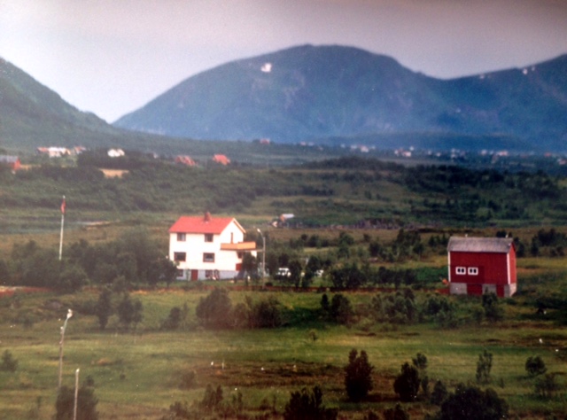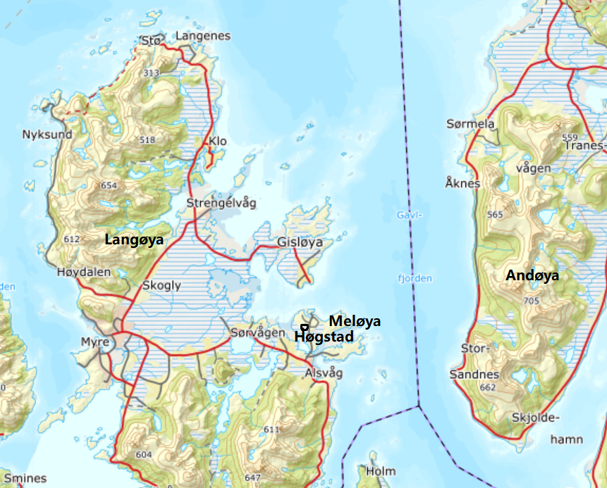 Midnattsolbildet helt øverst på siden her er tatt fra Meløya mot Gisløya. Foto: H. Rødsand.