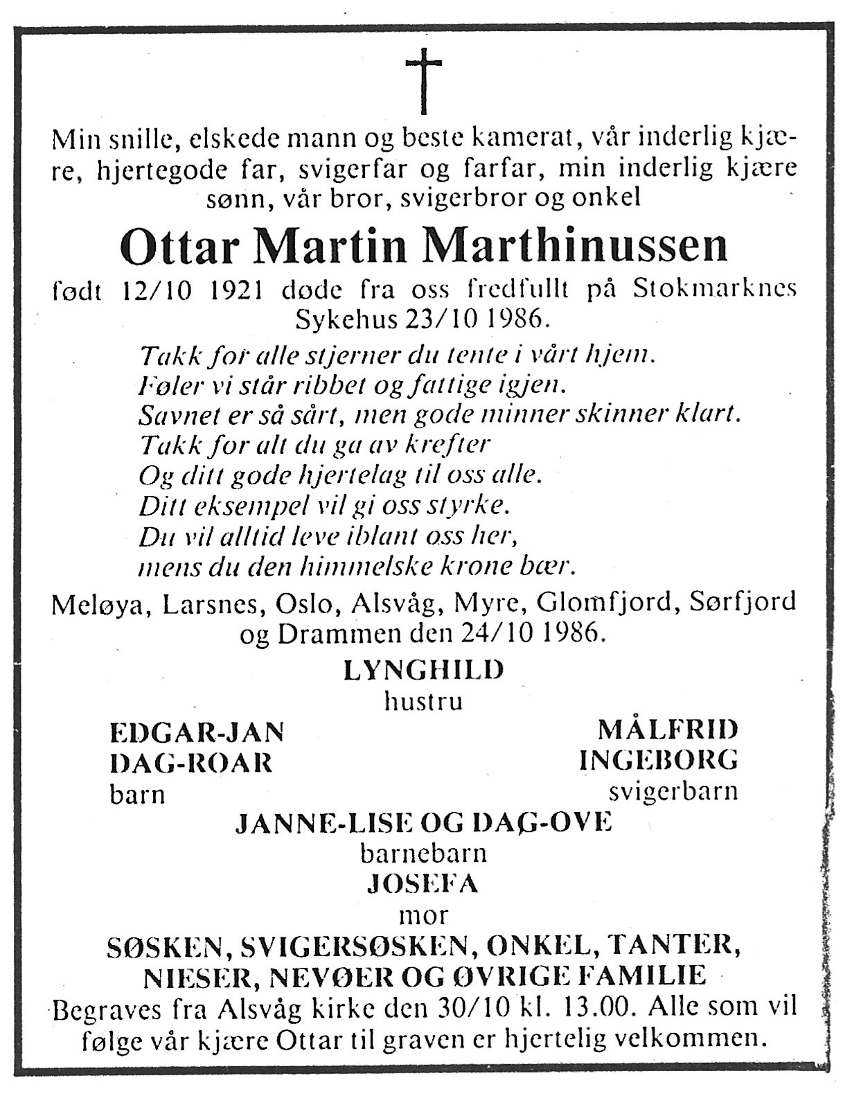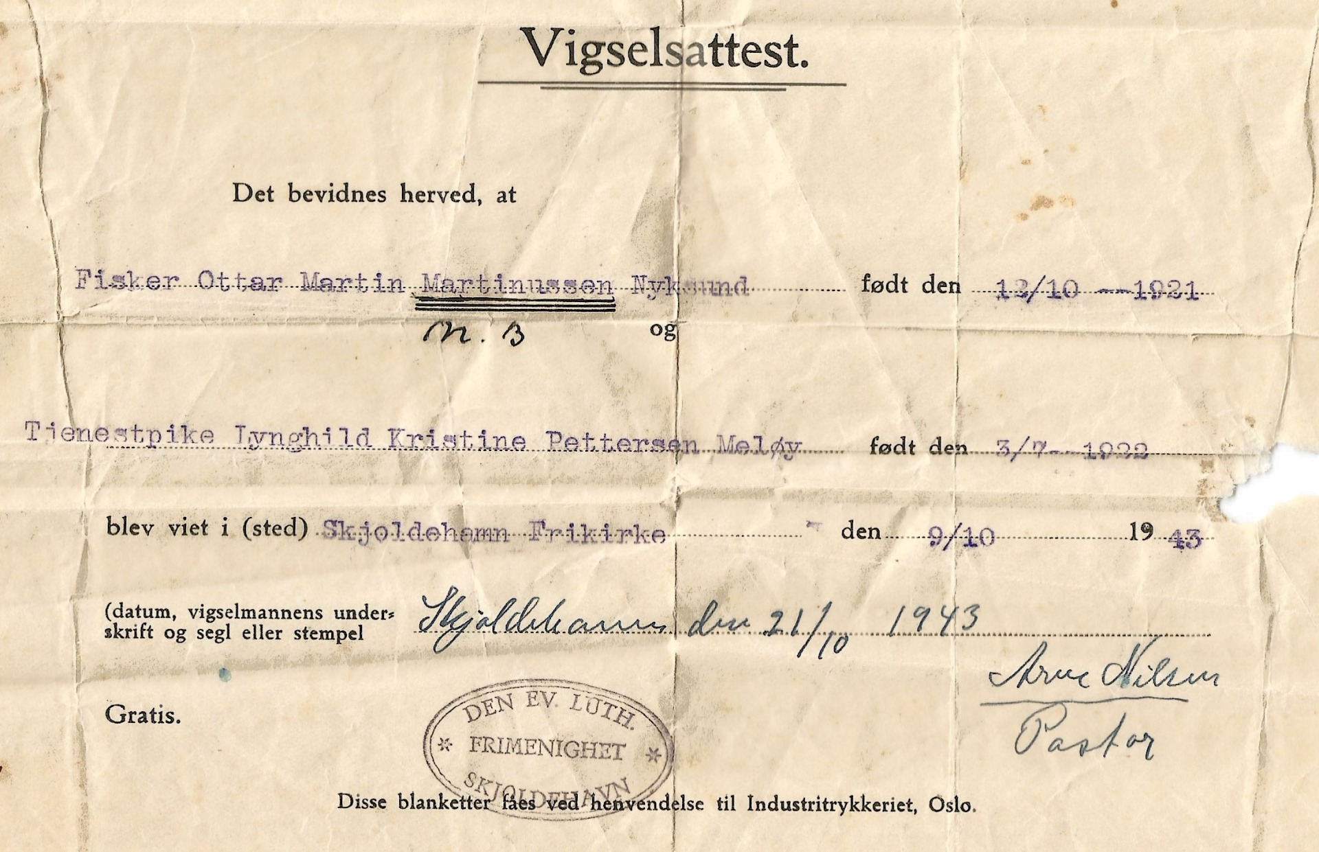 Og det var her i Nyksund at Lynghild traff han som skulle bli mannen hennes - Ottar Martin Martinussen. Han var født i Nyksund 13. oktober 1921 og var sønn av Josefa Olsen, født 1899 på Holmbakken i Lifjorden - og Eidor Martinussen, født 1897 i Nyksund.