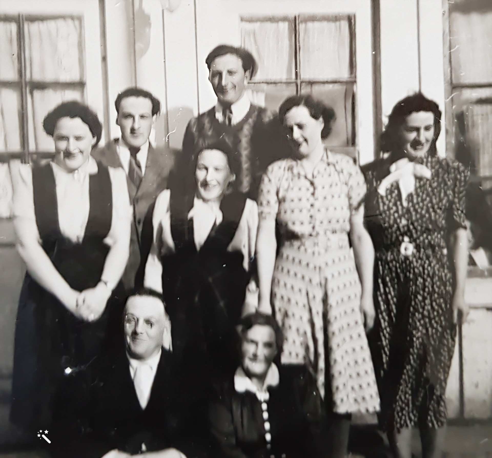 Søsken, mann og svigersøsken: Ivar, Ivarny (Mossi), Ester, Julie (Mole), Margit (g.m. John), Ottar, John, Lynghild og Odd (g.m. Mossi). Trolig tidlig 1950-tall.