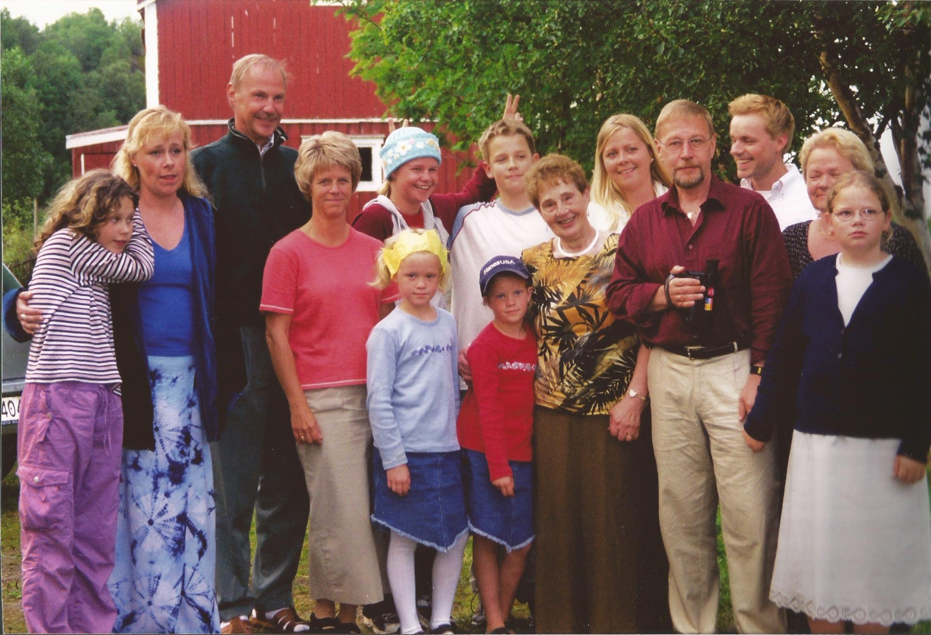 Lynghilds 80-årsdag. Lynghild står her med hele etterslekta pr. juli 2002. Etter dette er det kommet 10 oldebarn til.