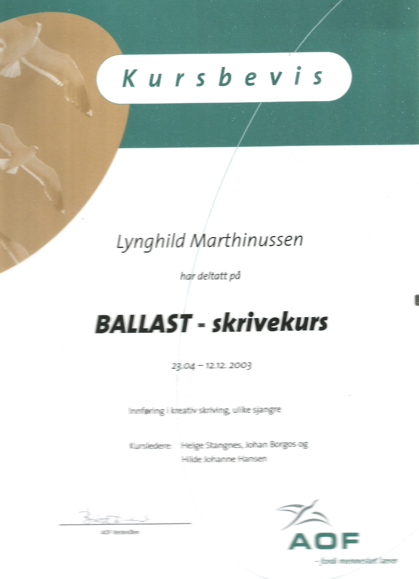 Så i en alder av 82 meldte hun seg på et skrivekurs - og etter det begynte hun å skrive fortellinger av alle slag og også eventyr. Mye av dette er publisert, blant annet i "Leddiken" - tidsskrift for Øksnes Historielag. Og noe av dette skrivearbeidet har foregått i gruppe med andre og en del av de som gikk skrivekurset har gitt ut tre bøker sammen - "Ballast 1, 2 og 3". Det er også publisert en del gjennom lokal- og regionalavisene i Vesterålen - men da mest dikt.
