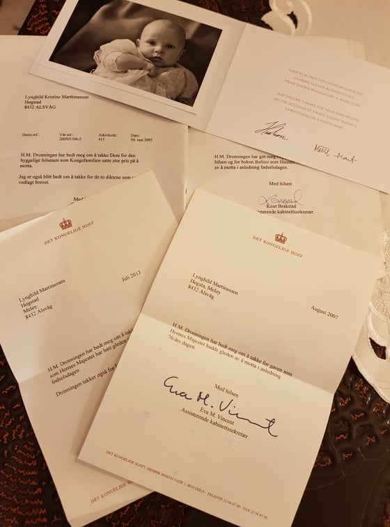 Takkebrev både fra Dronningen og Kronprinsparet. Lynghild har sendt både dikt og Ballastbøker til diverse begivenheter i Kongefamilien.