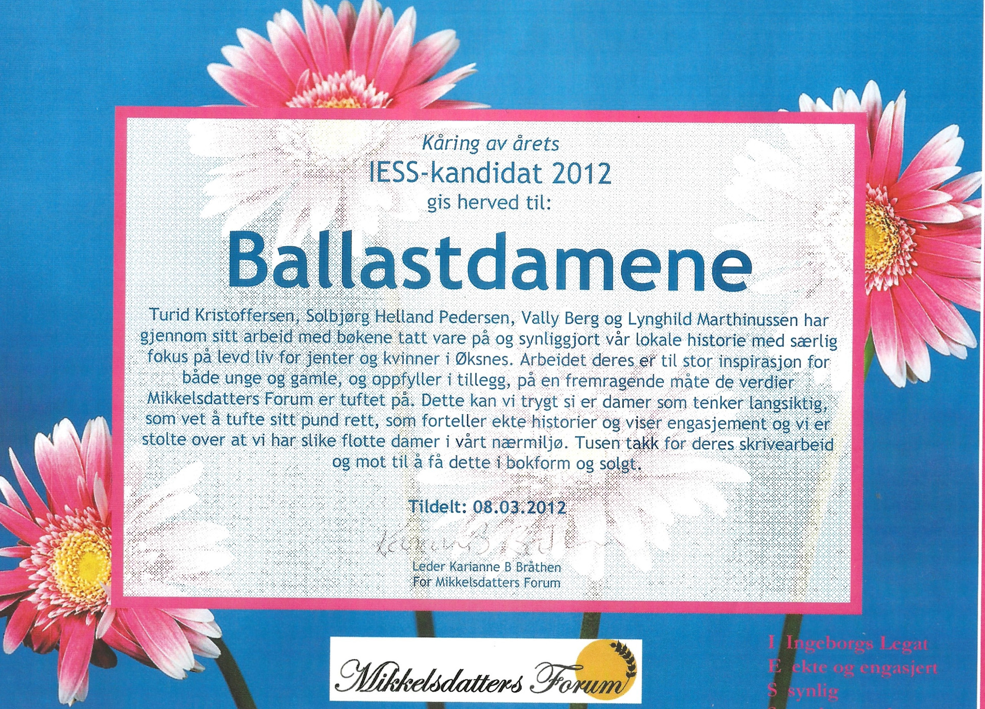 Mikkelsdatters Forum kårer Ballastdamene til Årets IESS-knadidat 2012. IESS stor for Ingeborgs Legat / Ekte og Engasjert / Synlig / Sterk og stolt