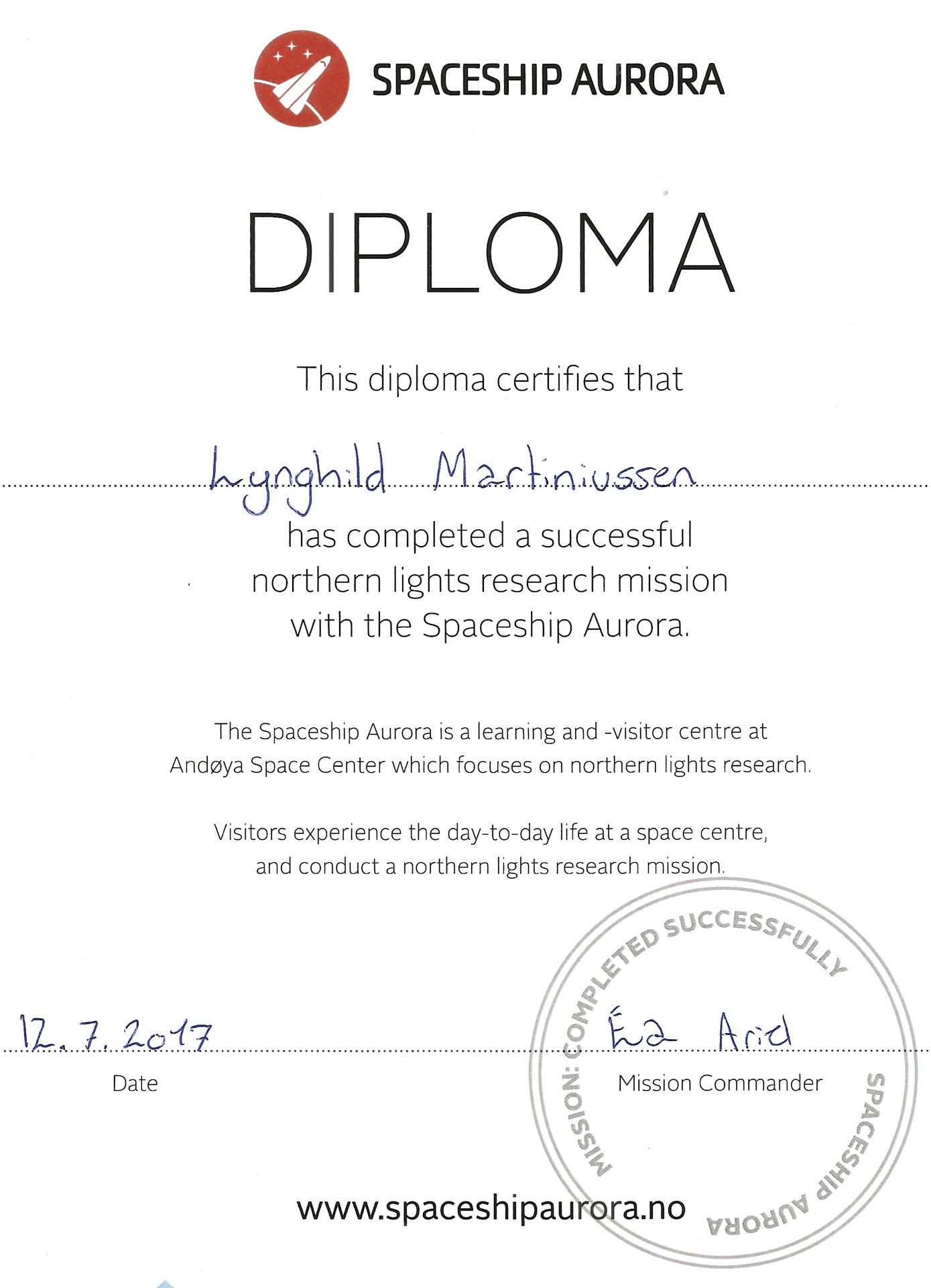 Diplom for gjennomført reise med Spaceship Aurora på Andenes, sammen med oldebarn Lilja.