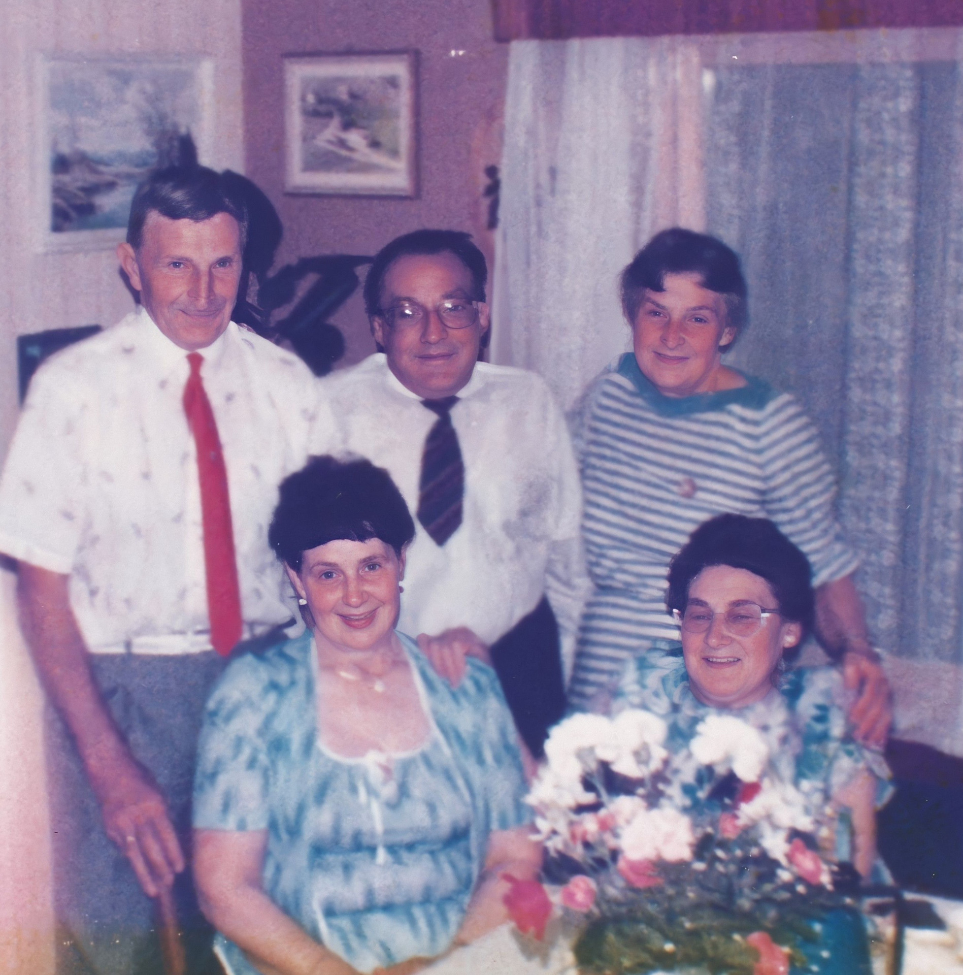 Lynghild med søsknene John, Ivar, Ester og Julie (Mole) i stua til John og Margit. Tidlig 1980-tall.