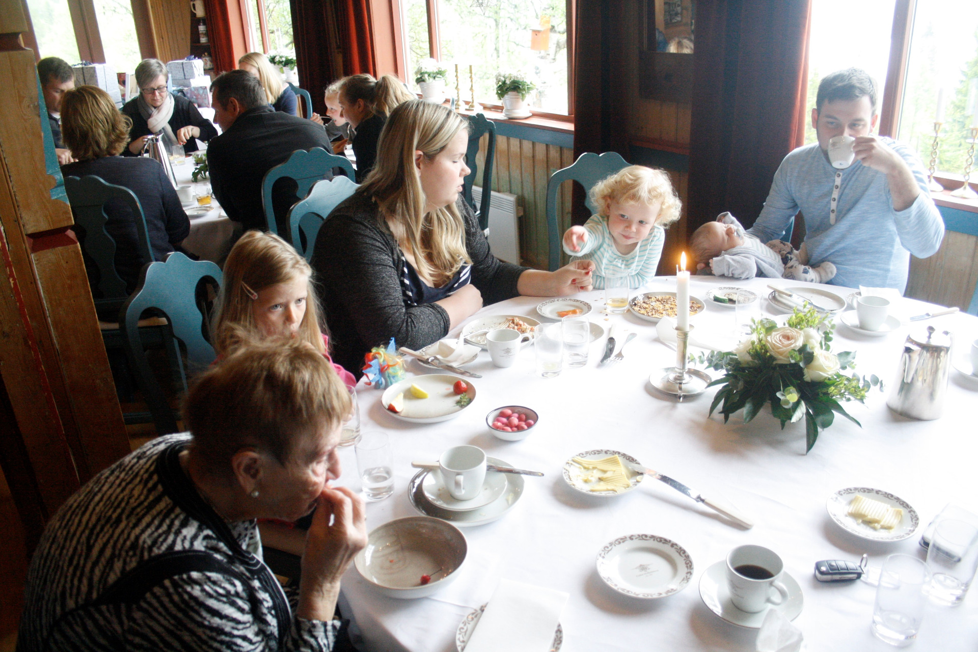 Frokost på Tuddal høyfjellshotell under oppholdet der i forbindelse med at barnebarn Dag Ove giftet seg med Christine. Vi ser Lynghild, Lilja, Ida-Kristin, Tirill og Jonny med Kasper.