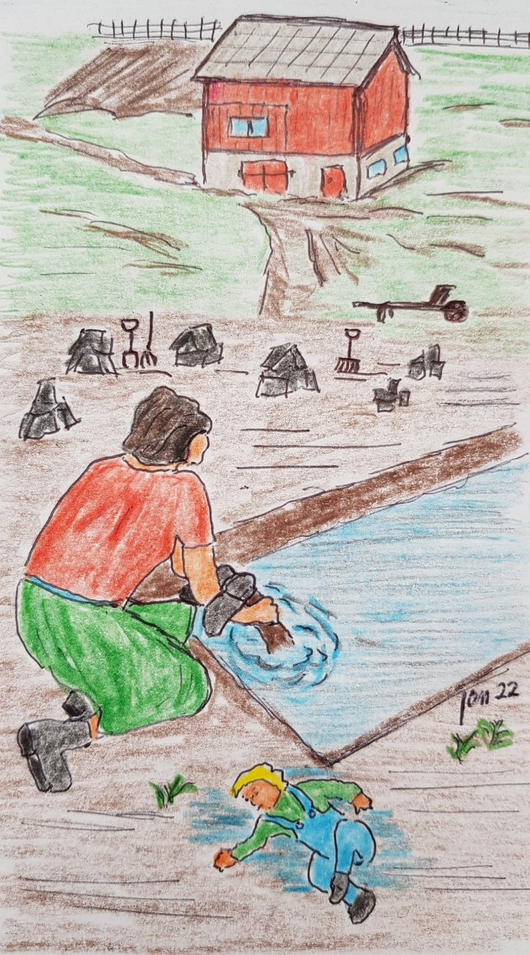 Svigermor til Lynghild, Josefa Olsen - bodde med en av sine døtre og hennes mann i en kjellerleilighet hos Lynghild og Ottar. Det kom også et par barn til verden der på slutten av 1950-tallet. Far til Lynghild drev en liten landhandel i nabogården og når en skulle dit var det vanlig å gå en snarveg over et torveområde og noe slåttemark. Forsommeren 1959 hadde man som vanlig torvet og den aller siste torvdammen stod åpen (noe den gjorde til året etter - da den ble fylt igjen med de øverste ubrukelige lagene fra nye torvdammer). Disse torvdammene kunne være over to meter dype og de gikk fulle av myrvann og regnvann. Ungene var nøye instruert om å ikke gå i nærheten av disse dammene, vi kunne falle uti og drukne.