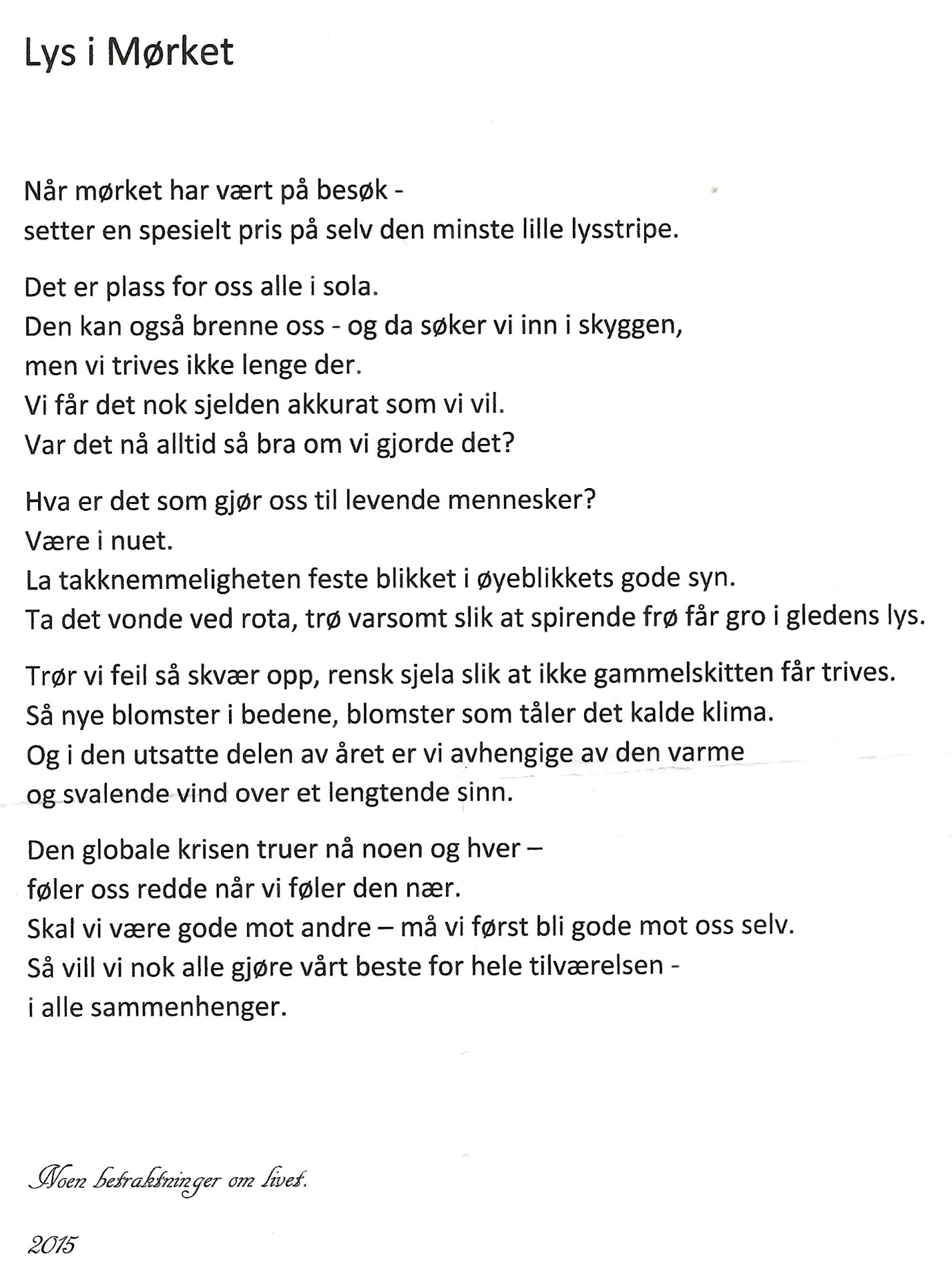 Når høstmørket kommer er det som om sjela eksploderer av Skaperverkets storhet. Mørket viker for lyset, som faktisk ikke er mindre vakkert etter at sola har ønsket oss "God mørketid" - der den kaster gullglans på lette skydotter.