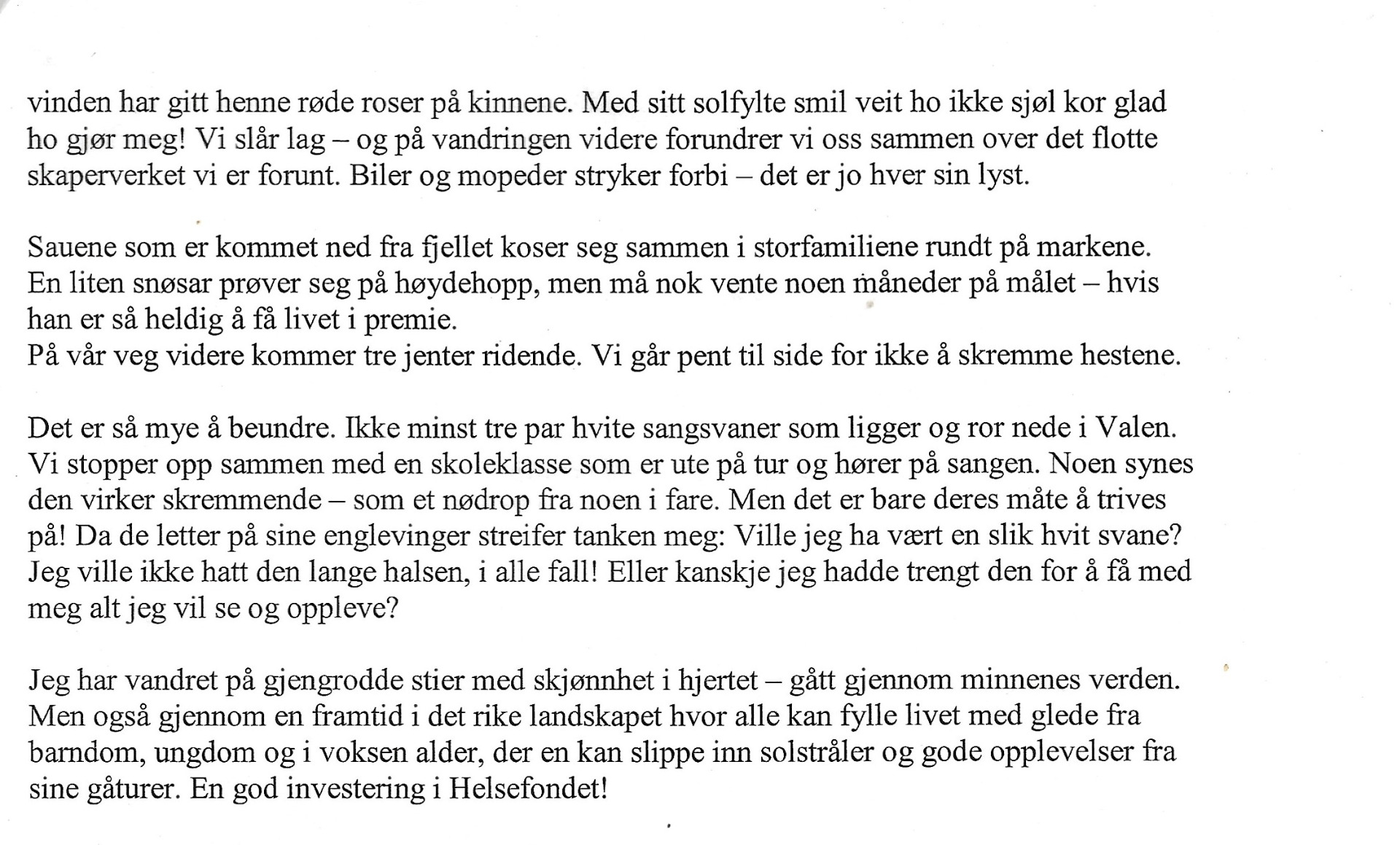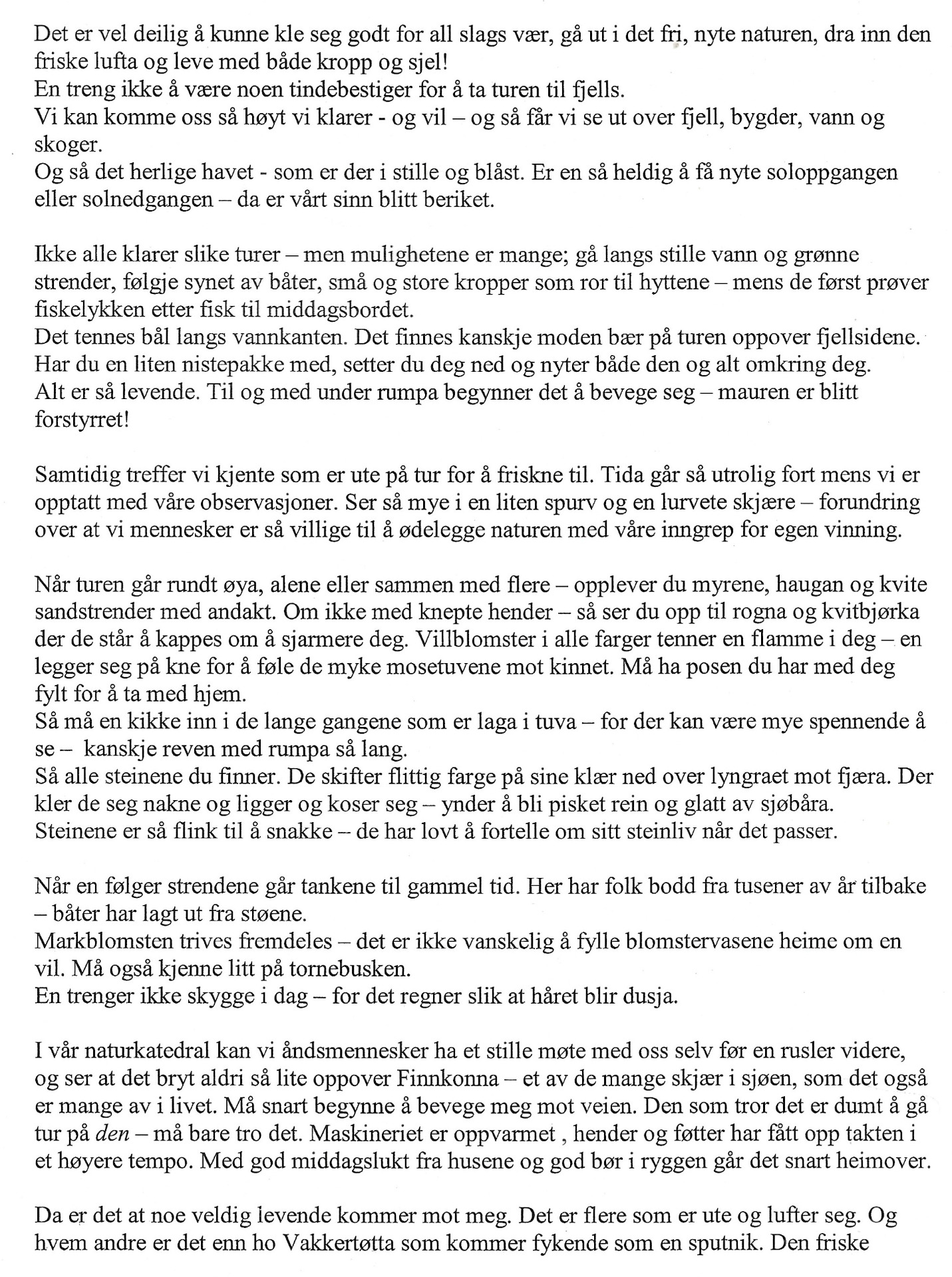 Med omsorg og slit gikk dagene og ukene med nedtelling mot gjensyn. Så hadde man Finnmarksbrevene som kallene skrev på når de trengte hvile. Brevene skinte jo som vårsola når de kom. Vi så alle fram til vårens to festdager; når finnmarksfolket kom hjem og 17. mai. Hvilken dag som ble feiret først var avhengig av fisket. Den dagen den store, hvite konvolutten ble hentet på Telegrafen, visste vi at ventetiden var slutt. Innholdet kunne lyde slik: