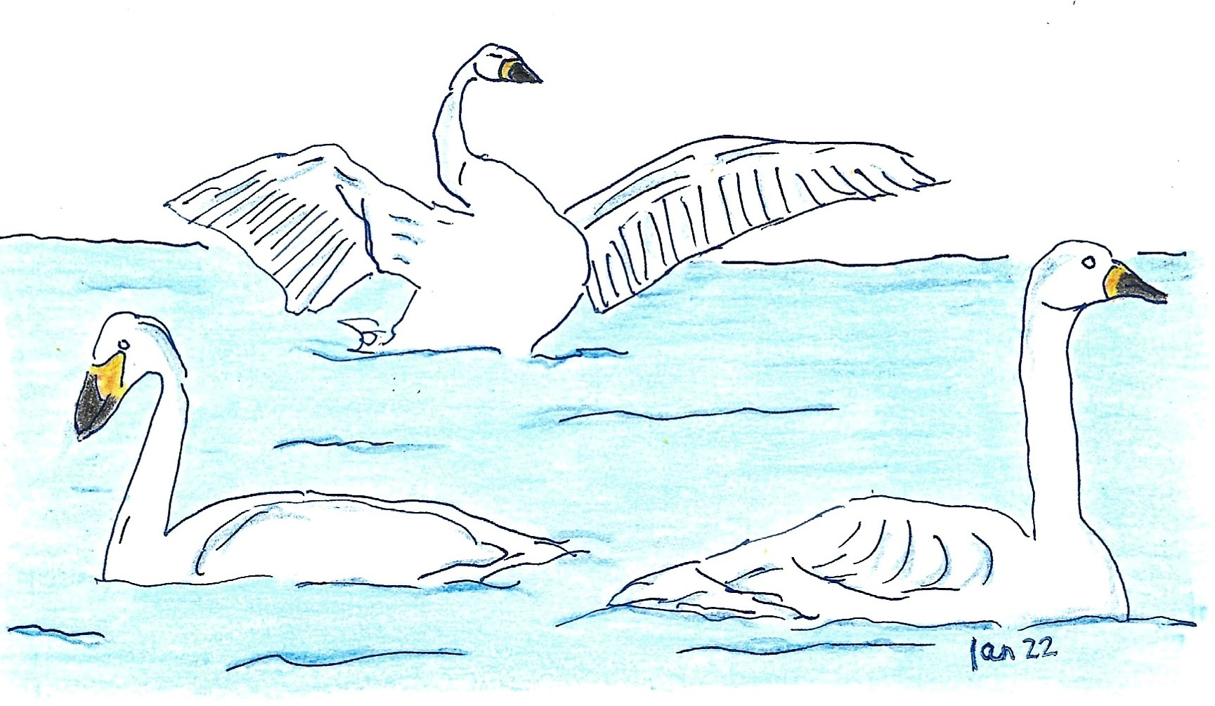 Svaner ved Valen. Penn og fargeblyanter JH.